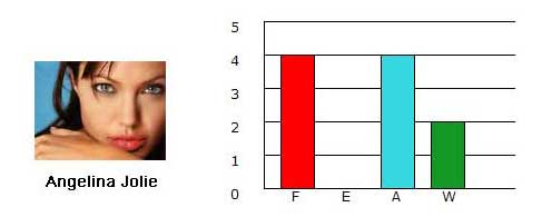 Here we find that Brad Pitt, who has much more Earth than Angelina Jolie (who has none!) provided her with stability and longterm security. Angelina Jolie has more Fire and gave him the push he needed to get married as well as to go around the world to satisfy her need for emotional security (more Water) and mothering instincts (Venus in Cancer) by adopting and having children. Interestingly, the conflict that shows in the graph below is offset by their acting as they even tried their best to bomb and kill each other in Mr. and Mrs. Jones!